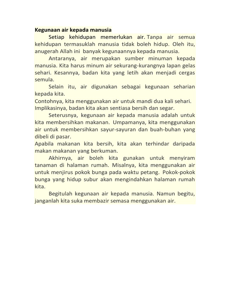 Kepentingan air kepada manusia karangan. Esei kepenggungunaan kepentingan air kepada manusia azra. Semua makhluk ciptaan tuhan memerlukan air untuk hidup. Contohnya kita menggunakan air untuk mandi dua kali sehari. Antaranya air merupakan sumber minuman kepada manusia.