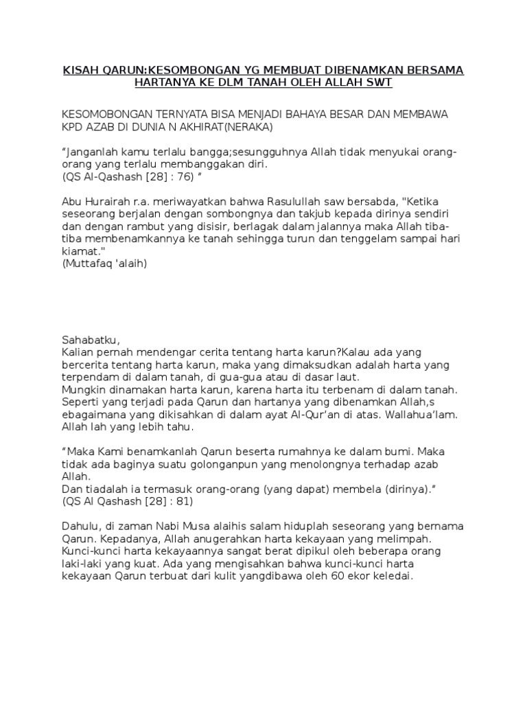 Kisah Qarun Kesombongan Yg Membuat Dibenamkan Bersama Hartanya Ke Dlm Tanah Oleh Allah Swt